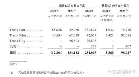 其中,物流枢纽场景于2024年贡献收入1.82亿元(人民币,下同),占总营收的71.6%;2025年上半年实现收入约1590万元,占总营收的16.1%。公路物流场景2024年贡献收入约4210万元,占总营收的16.6%;2025年上半年实现收入约8260万元,占总营收的83.5%。城市交通场景处于商业化早期,2023-2024年累计收入约5660万元;由于进行中的项目尚未竣工以供交付及最终验收,截至2024年及2025年6月30日止六个月并未实现任何来自城市交通场景业务相关收入。