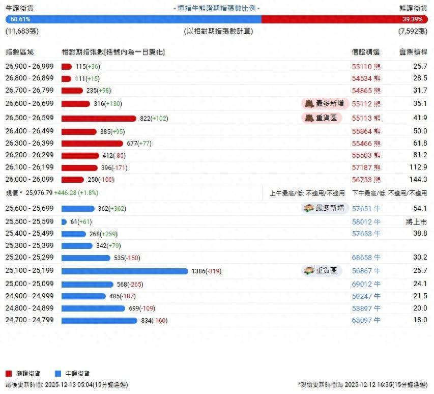 智通财经APP获悉,截至12月13日,恒指最新的牛熊街货比例为61:39。